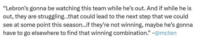 北京时间10月12日,距离新赛季NBA常规赛开战还有10天的时间。针对湖人队球星詹姆斯的伤病和前景,湖人队记者Dave McMenamin做客ESPN节目时表示,如果湖人不能赢球詹姆斯可能会离开。