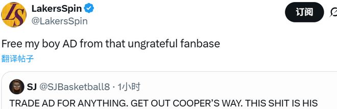 湖人媒体LakersSpin写道:“把我的兄弟AD从那个不知感恩的球迷群体中解放出来!”