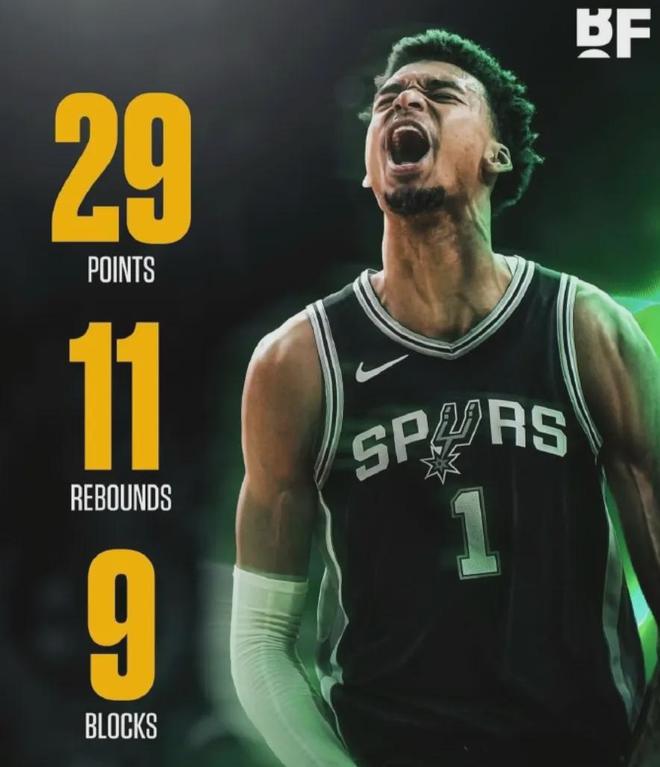 加时赛里,文班亚马再送封盖,全场个人9次封盖,随后出现犯规,6犯离场。